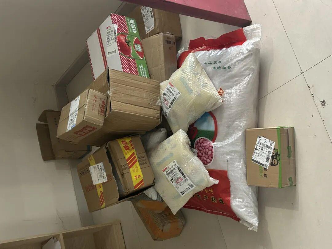 从餐厅离开的时候,记者注意到,门口角落处堆放了一些快递,里边有小米、木耳、油等,工作人员告诉记者,这些都是由爱心网友捐赠的。