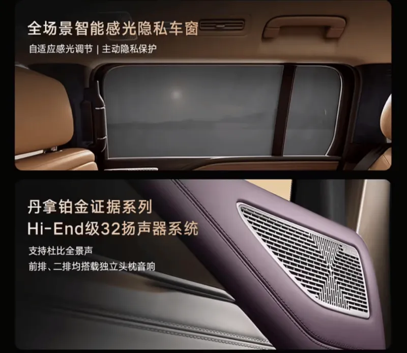 该车还配备全场景智能感光隐私车窗,支持自适应感光调节、主动隐私保护;拥有丹拿铂金证据系列 Hi-End 级 32 扬声器系统,支持杜比全景声,同时前排、二排均搭载独立头枕音响。